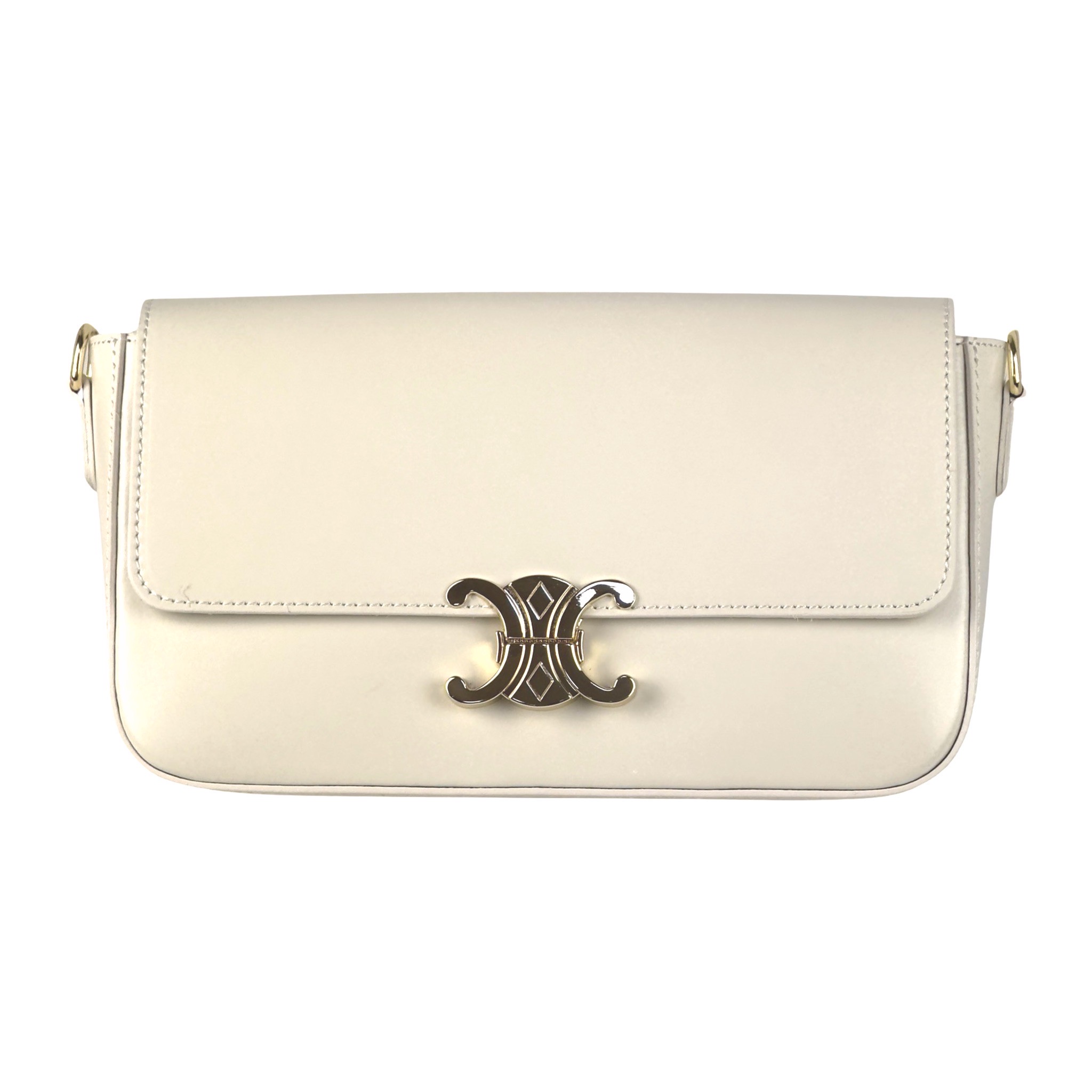 A truly elegant handbag design, distinguished by its front metal lock and wide leather crossbody strap.