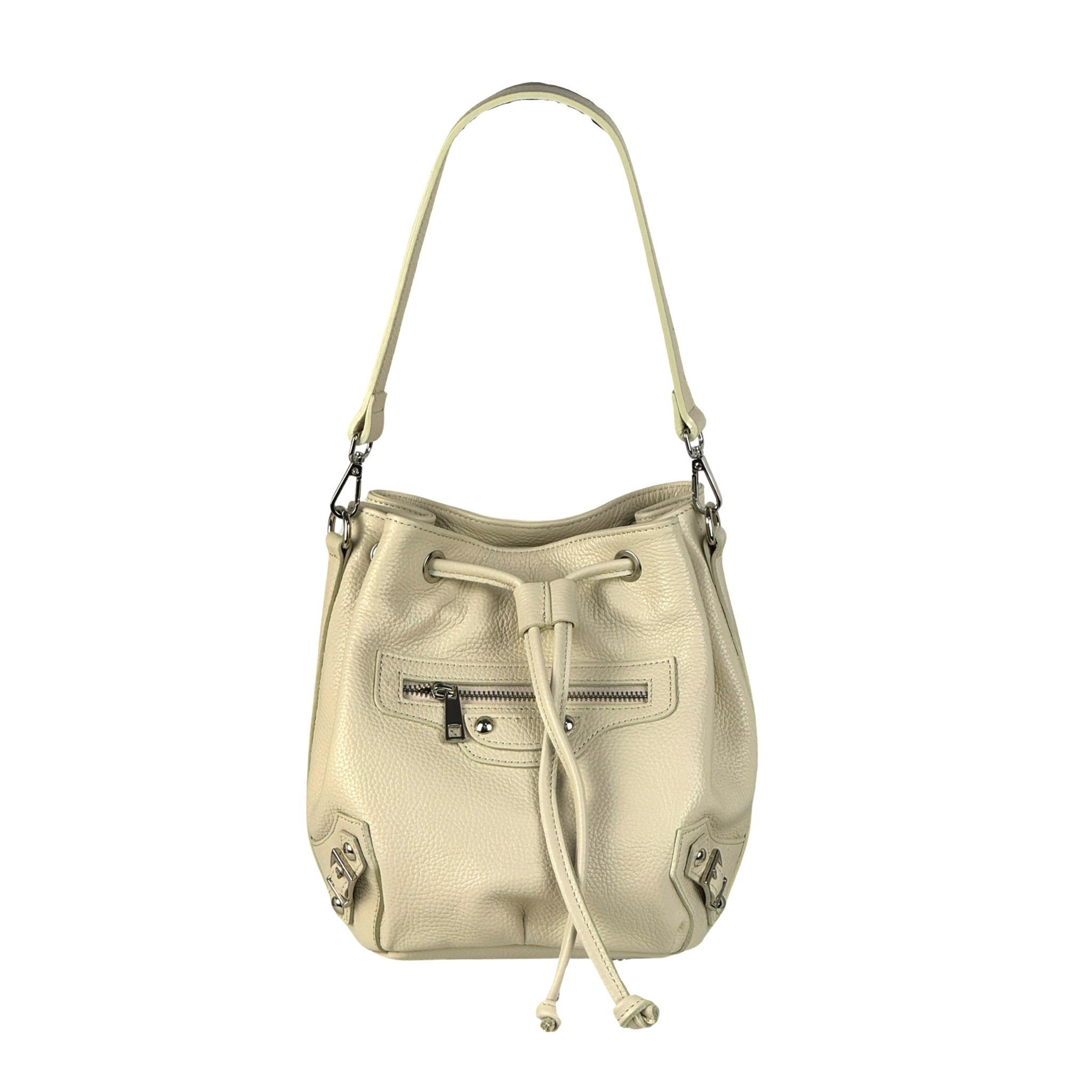 A young and trendy bucket bag, with top handle and crossbody strap. Pebbled leather handbag with drawstrings. Round bottom, semi-soft design. Nikel plated hardware. A detachable, adjustable leather crossbody strap is provided. Both the handle and crossbody strap are detachable.