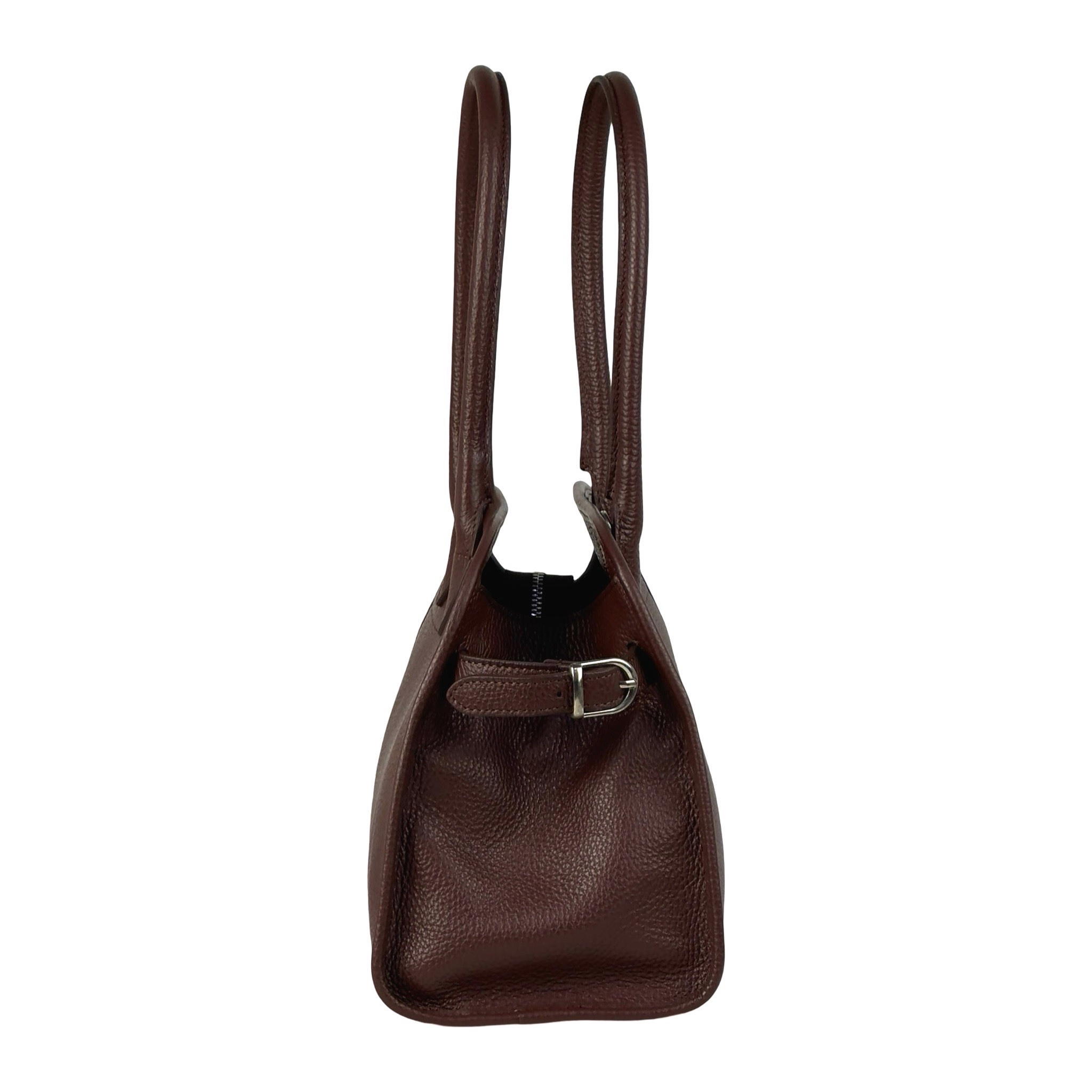 A compact, pebbled calf leather handbag.