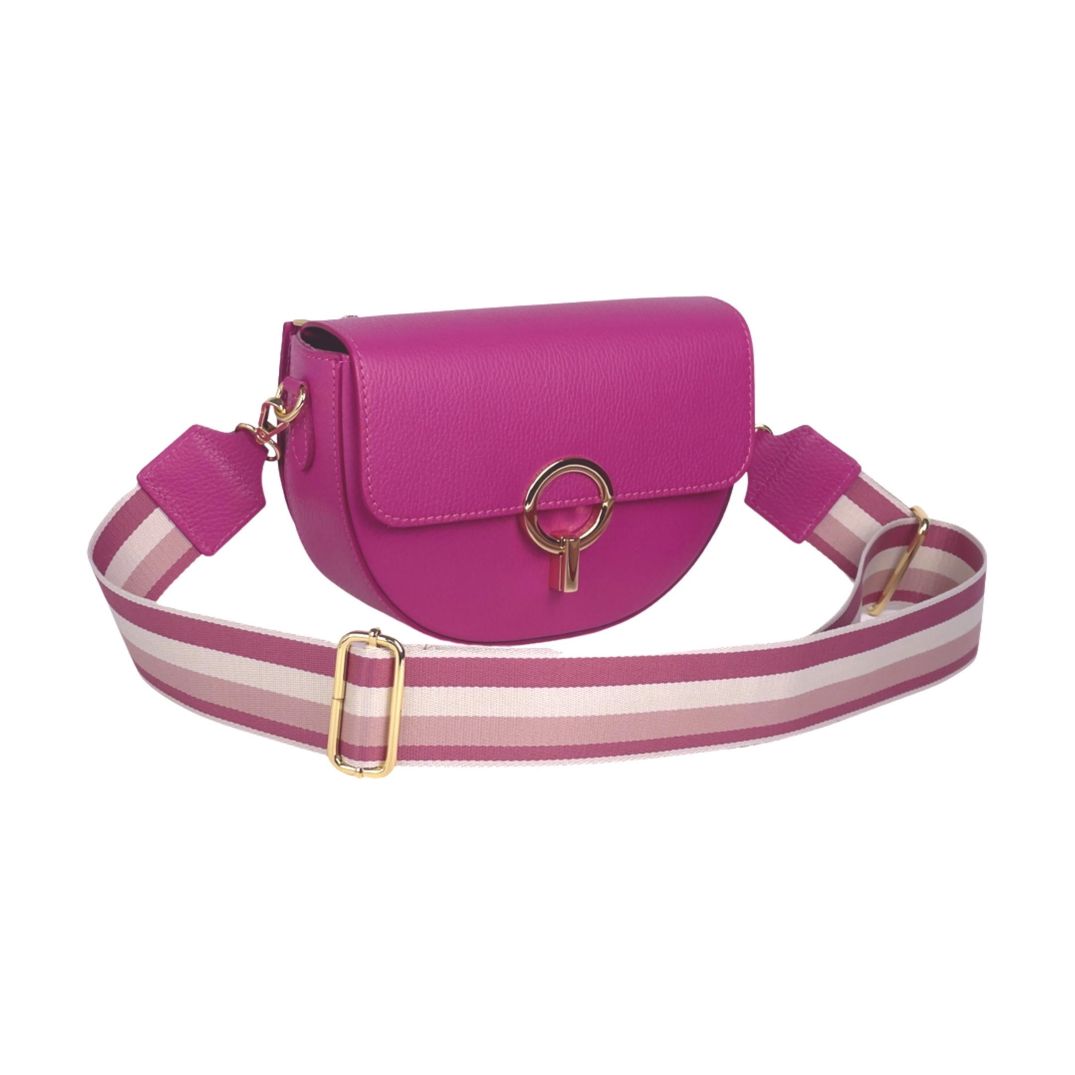 A compact, pebbled leather crossbody bag. A sporty and elegant design, distinguished by its front metal lock and wide cotton mesh crossbody strap, it is offered in a range of trendy colours.